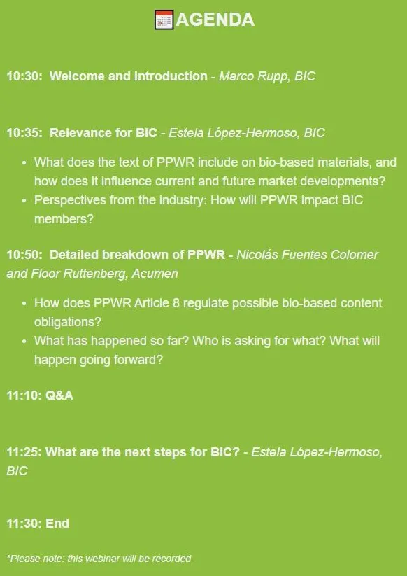 Before attending this webinar, please be sure to go through this pre-read document which will inform you about the key aspects of the PPWR on bio-based content relevant to BIC members.